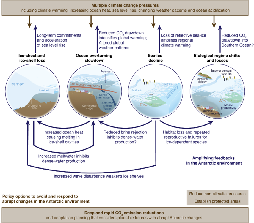 The changes that are developing in the Antarctic environment have many interactions that amplify the risk of initiating abrupt and irreversible changes in this region. These interactions also feed back to worsen regional and global climate change impacts beyond the Antarctic region.
