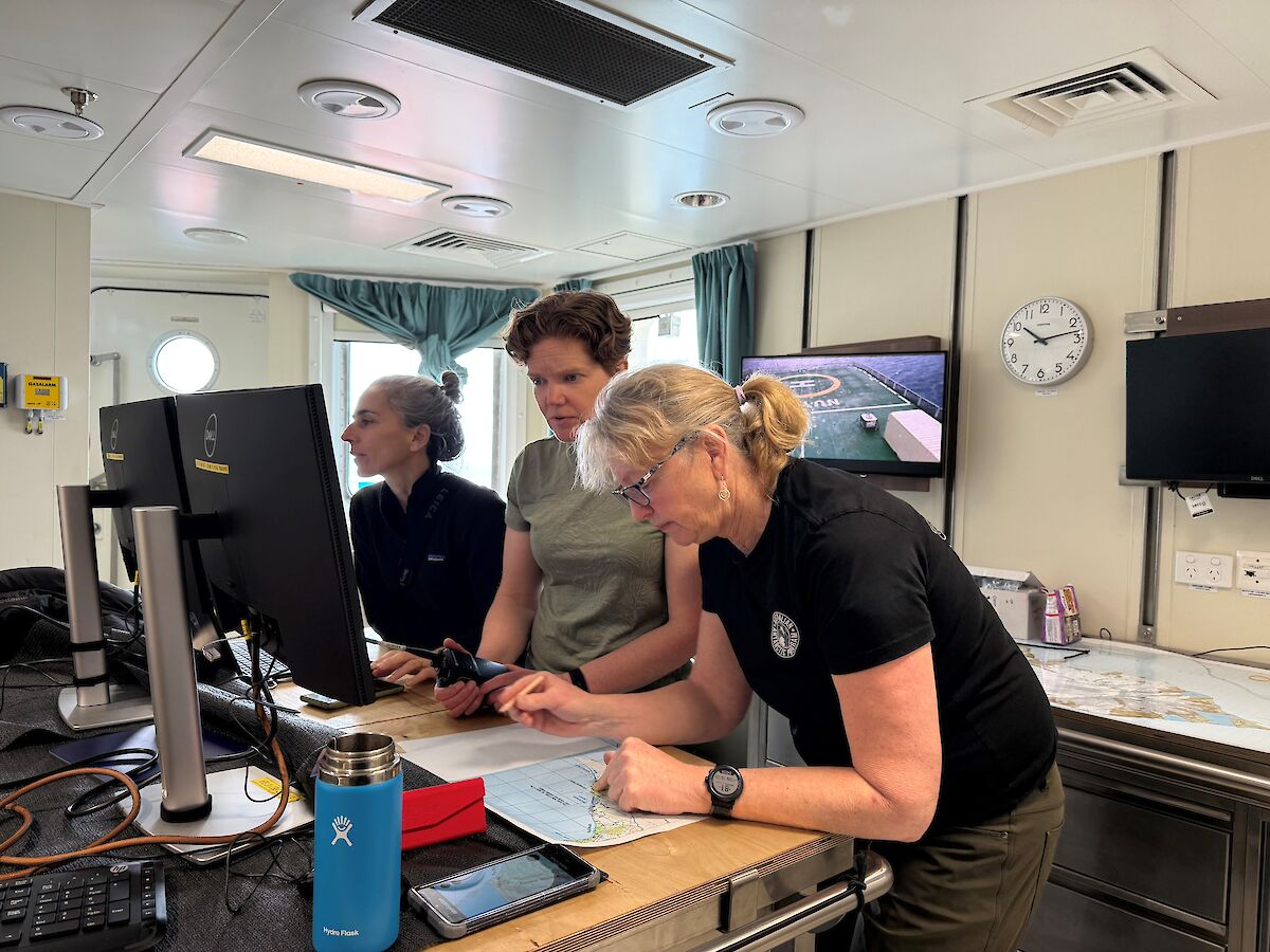 The M400 drone was operated by two people, braving the elements on what’s known as the monkey deck on level 11. Scientists were set up in a lab near deck 9, watching pictures transmitted to their screens from the drone in real time. They could then direct the drone pilots to move left or right, or zoom in on a particular frame, if they found something of particular interest. It meant they could assess kilometres of coastline before setting foot on the island.