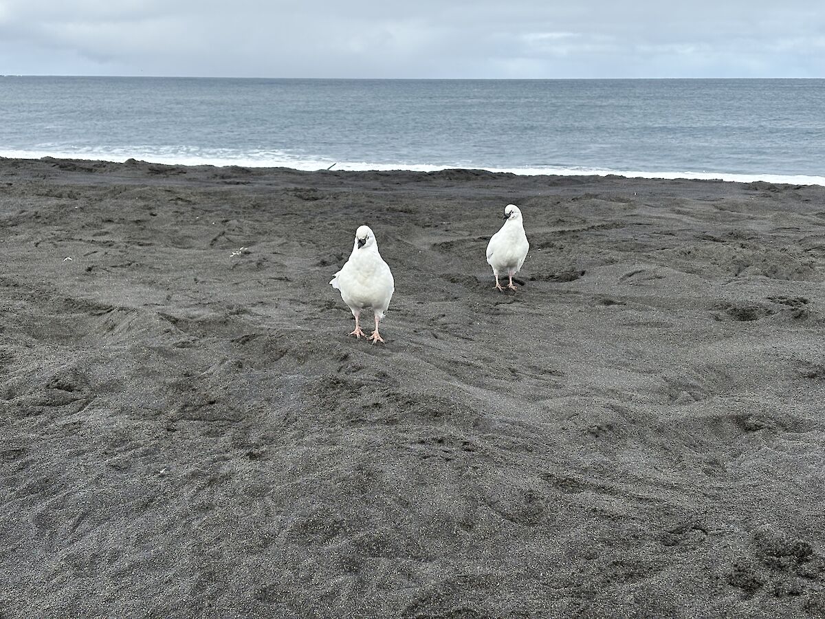 The black-faced sheathbills have personalities all their own. They watch us, in our bright orange suits, and show keen interest in the work we're doing.
