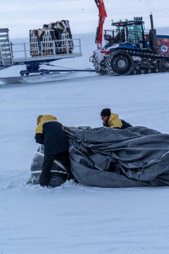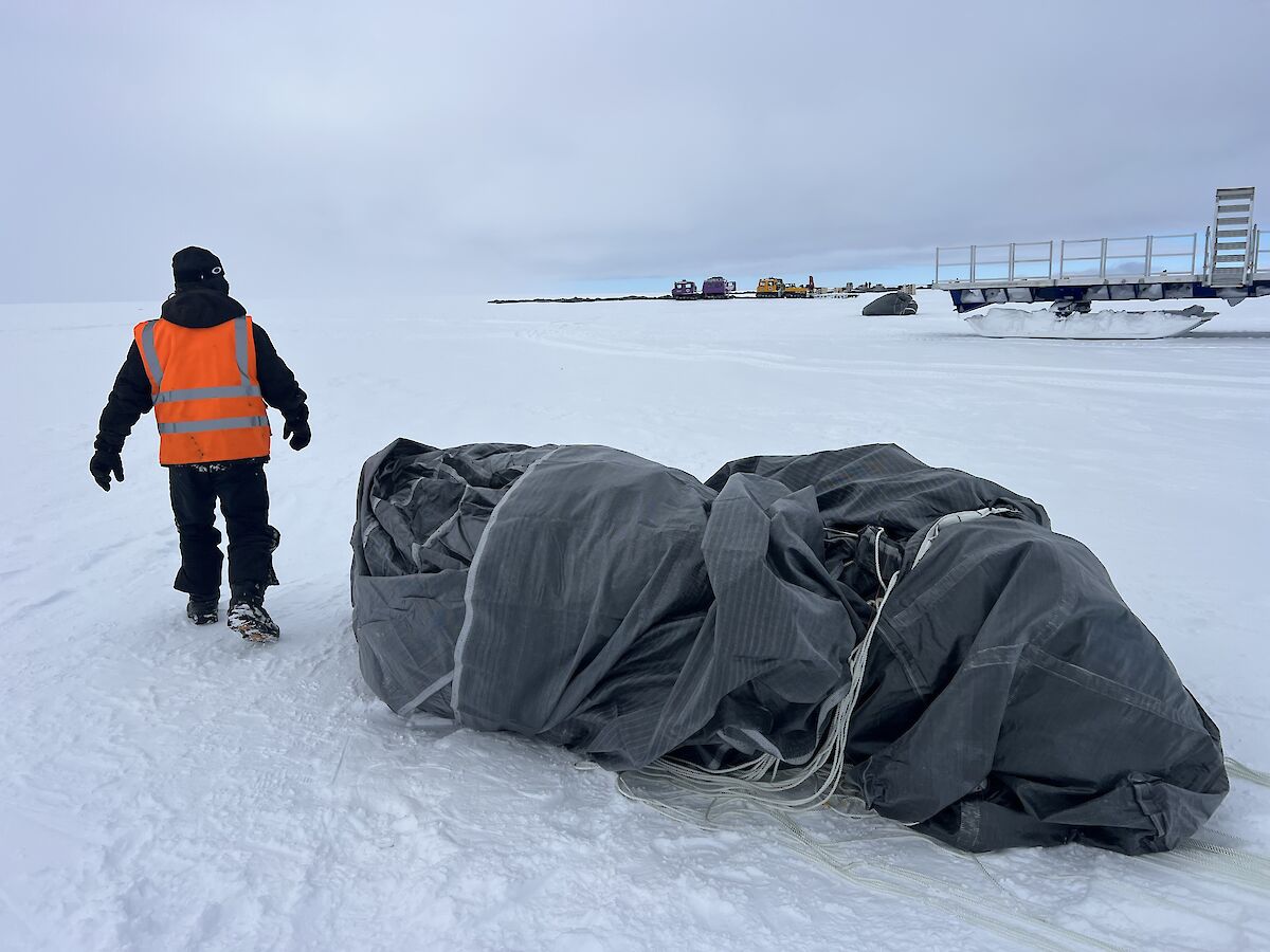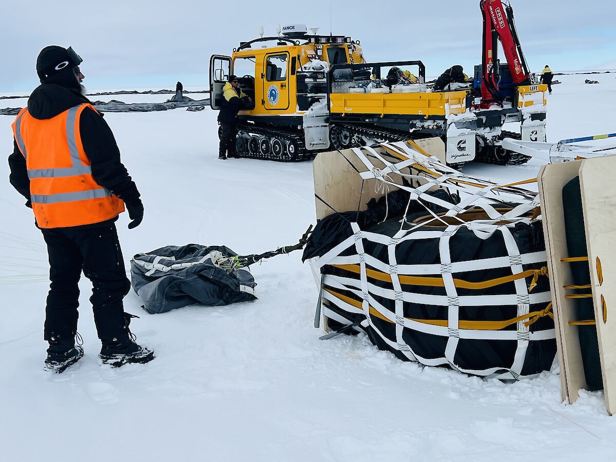 Weather observations began at 2am on station and at 5am at the Drop Zone. As the day unfolded, cloud and visibility slowly improved on a calm, near windless morning. Finally, the parachutes appeared, gracefully descending from the clouds. We couldn’t see the C-17 above, but as with the helicopters days before, silence fell across the team as everyone craned their necks skyward. One by one, the packages touched down in the stillness of Antarctica.