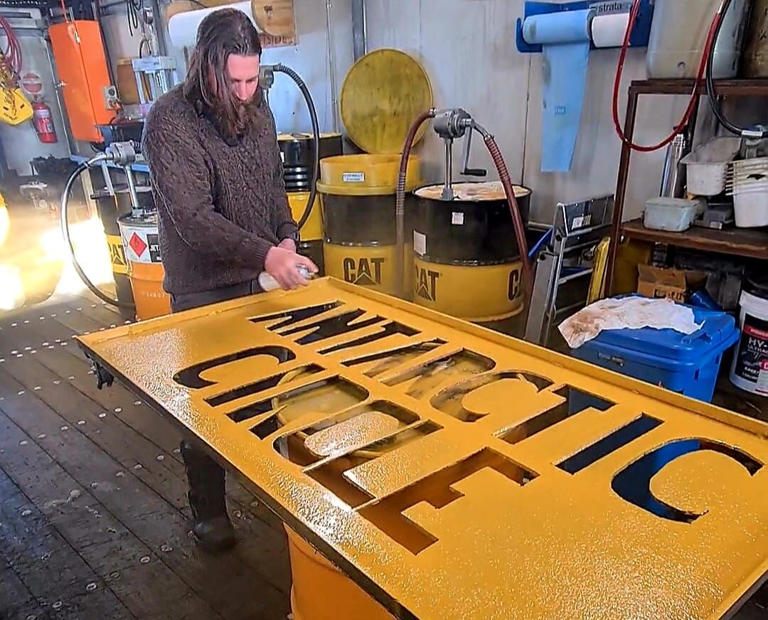 After some tricky Macgyver handywork from yours truly, to remove some old dried paint blocking up the rattlecan nozzles, Jack and I are now painting. A few coats later and this Antarctic Circle sign is looking Micky Mouse.