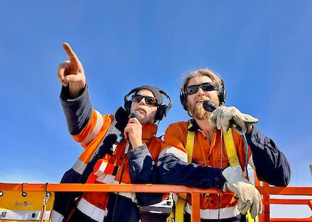 Davis station had a significant blizzard event last month, winds reached gusts of 165 km/h this was paired with a large snowfall event. Much of our equipment was impacted. Our Stevenson screen (instrument enclosure for temperature and humidity probes) was full to the brim with snow and our anemometer (records wind speed and direction) was jammed with snow, freezing the 10 m mast in place. Both are quite arduous tasks to rectify. Once the winds had subsided on Monday, our technician Adam assisted by observers Jason and Hana worked to get all equipment back up and running. Adam was required to climb the 10 m mast to troubleshoot and fix the issue, all this being done in −25˚ Celsius temperatures. Adam radioed info to folks on the ground to ensure the direction of the anemometer vane was accurately calibrated.