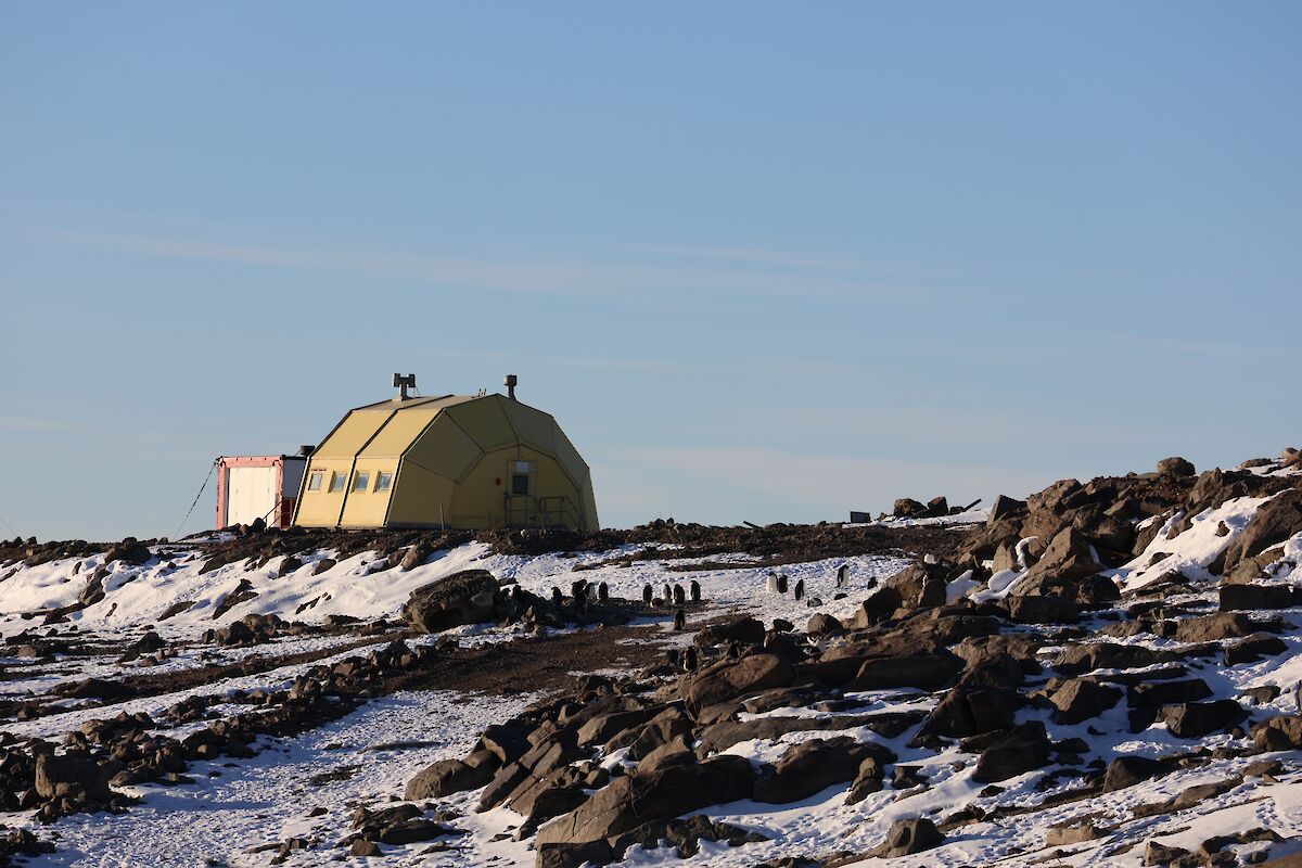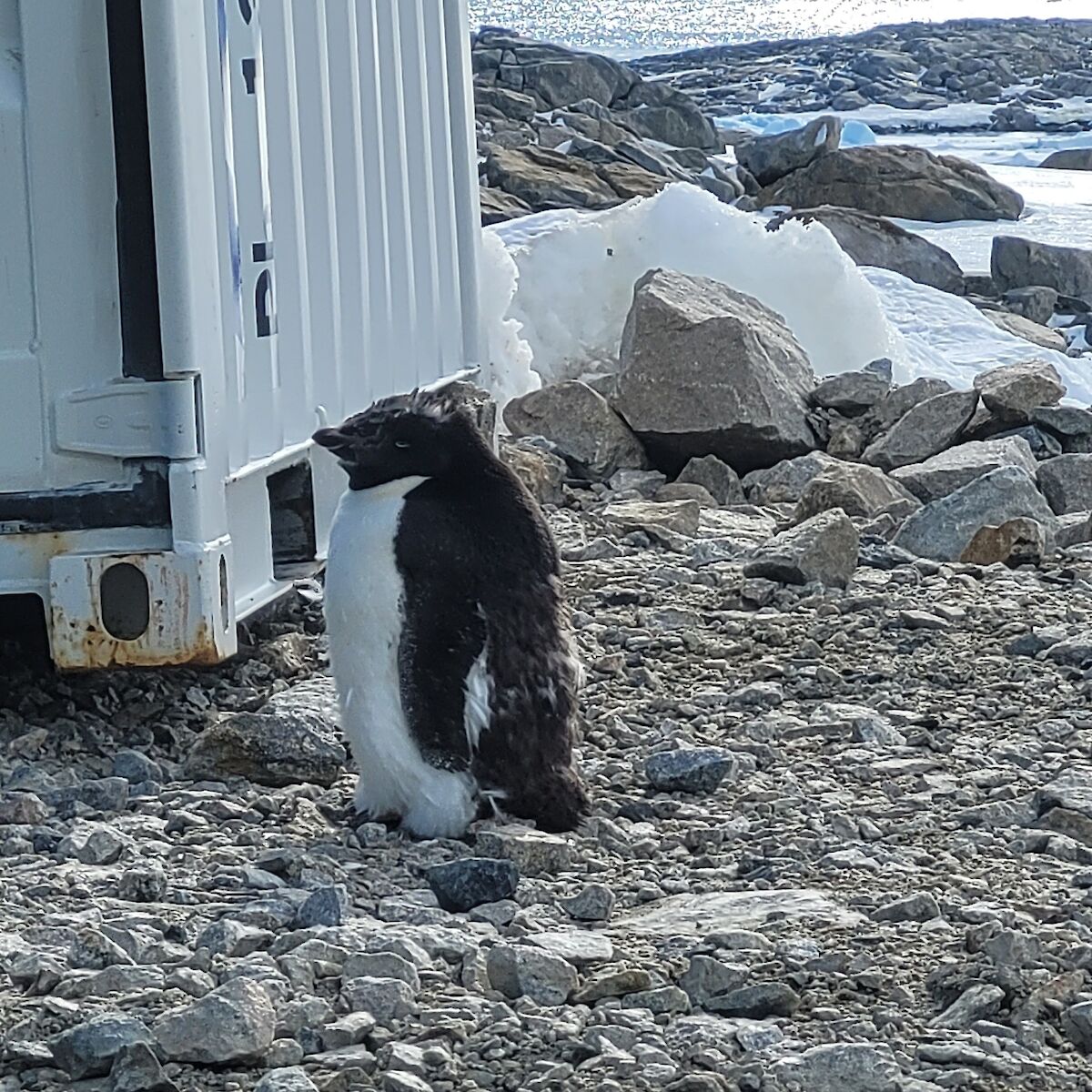 Euuurgh. Another day standing around waiting for my feathers to fall out, getting bombarded by Johnny’s bad poetry. I found a funny rock to shelter behind - it’s big and rectangular and green. Can I even see in colour? Strange extra-tall penguins go in and out of it all day. Their feathers are weird, I think their moult isn’t going so well . . .