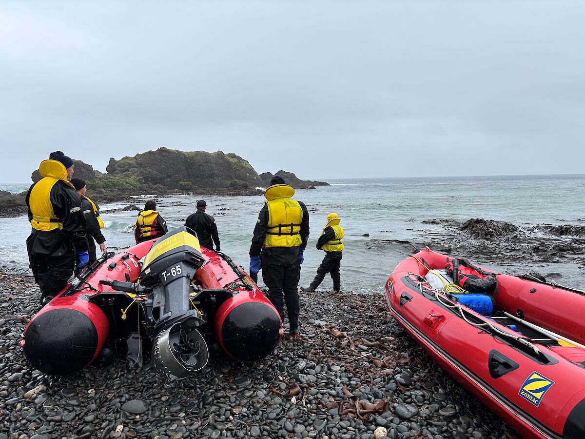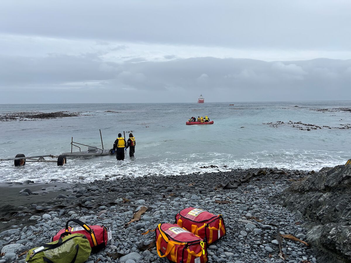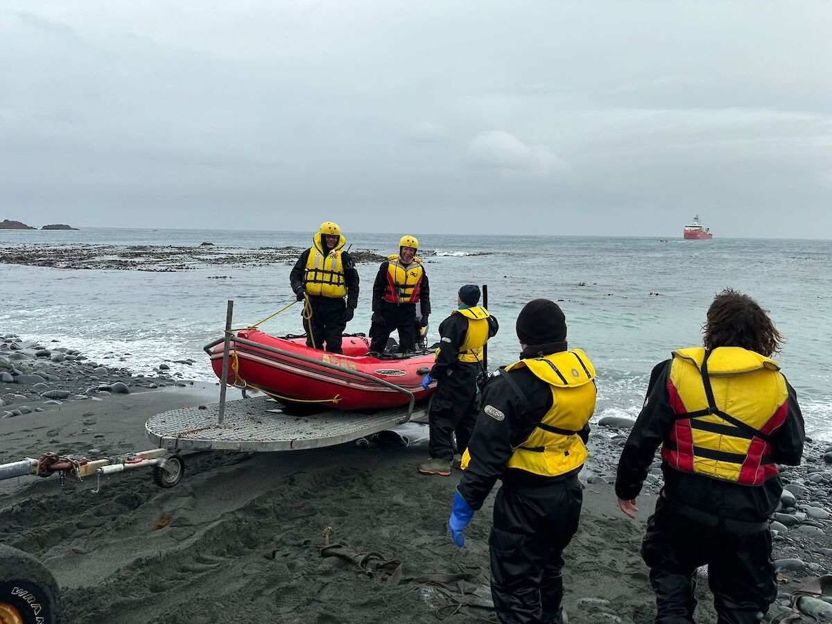 At 1720 on Tuesday 17 December, our two IRB crews transferred via sea from Garden Bay to Landing Beach. The French Navy positioned their rigid hull inflatable boat (RHIB) 100m offshore to await transfers. And then, like a well-tuned orchestra, the symphony began. Outbound passengers, two at a time with their cargo, moved from shore in an IRB to the RHIB and vice versa. The IRB would pull up alongside the RHIB and an efficient transfer of outbound and inbound passengers and cargo took place. The loaded RHIB would then take passengers and cargo to the L’Astrolabe.