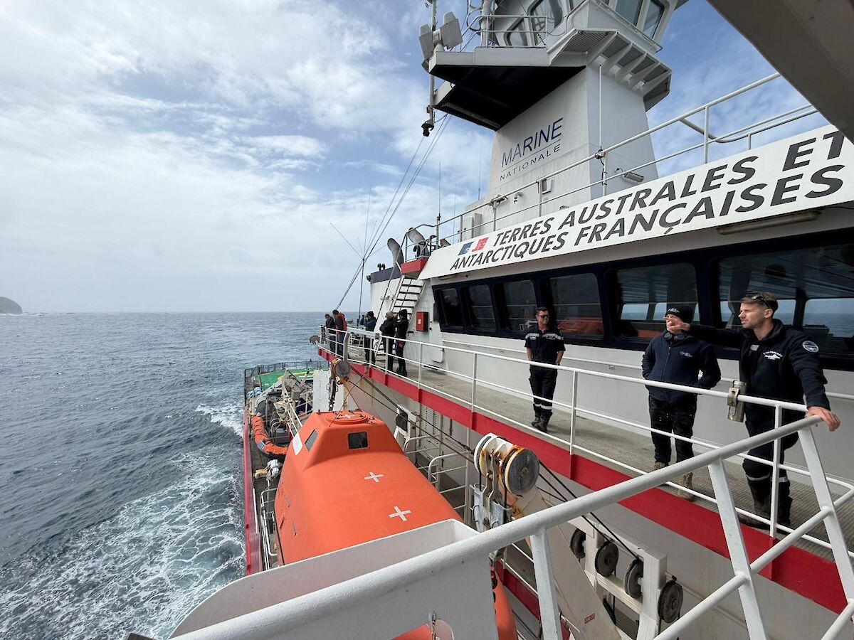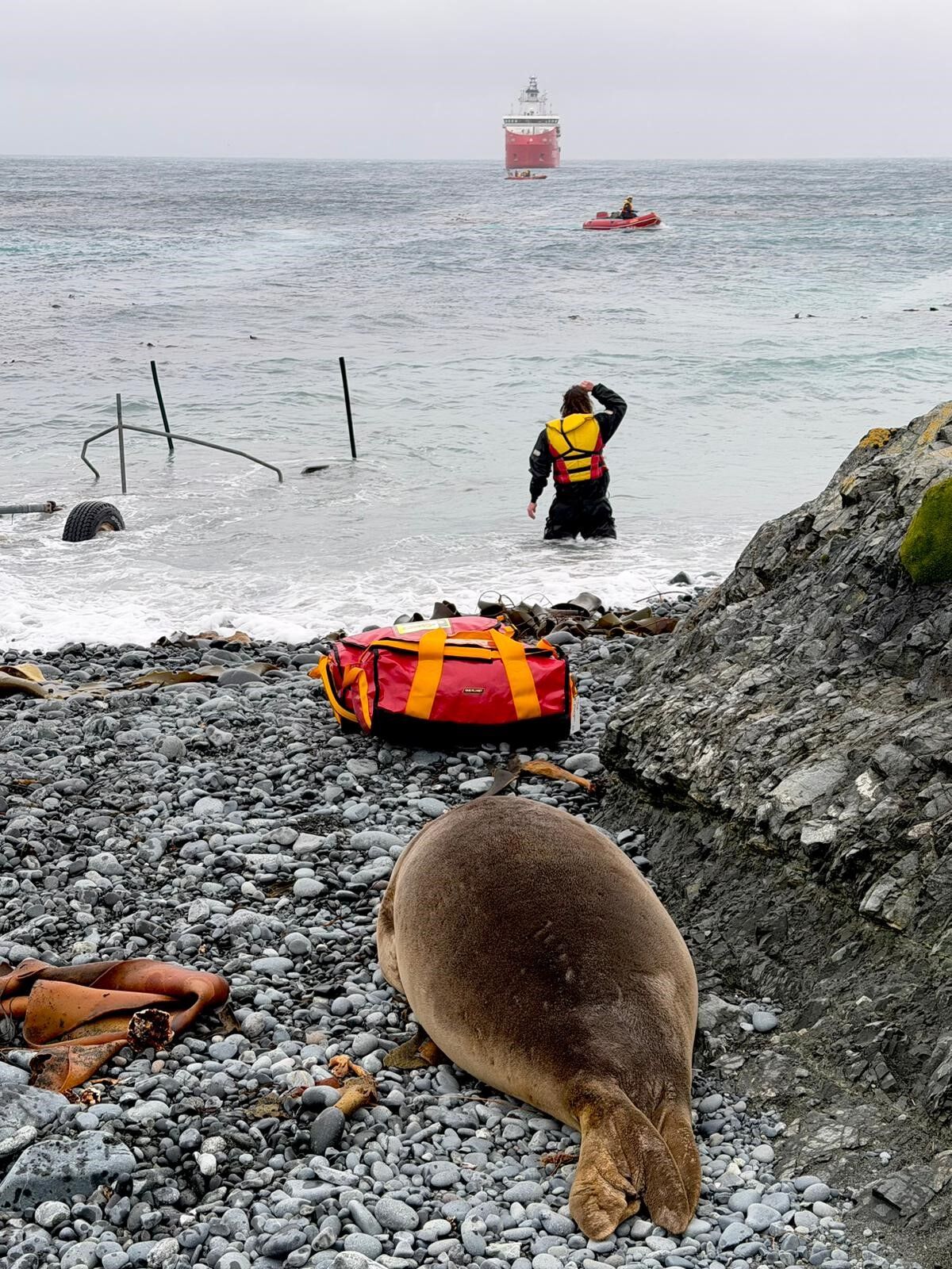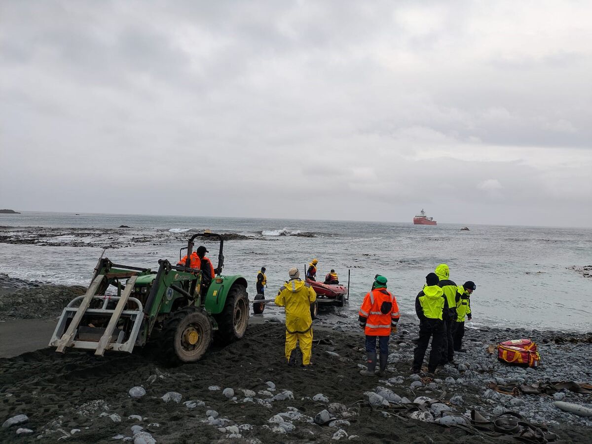 At 1720 on Tuesday 17 December, our two IRB crews transferred via sea from Garden Bay to Landing Beach. The French Navy positioned their rigid hull inflatable boat (RHIB) 100m offshore to await transfers. And then, like a well-tuned orchestra, the symphony began. Outbound passengers, two at a time with their cargo, moved from shore in an IRB to the RHIB and vice versa. The IRB would pull up alongside the RHIB and an efficient transfer of outbound and inbound passengers and cargo took place. The loaded RHIB would then take passengers and cargo to the L’Astrolabe.