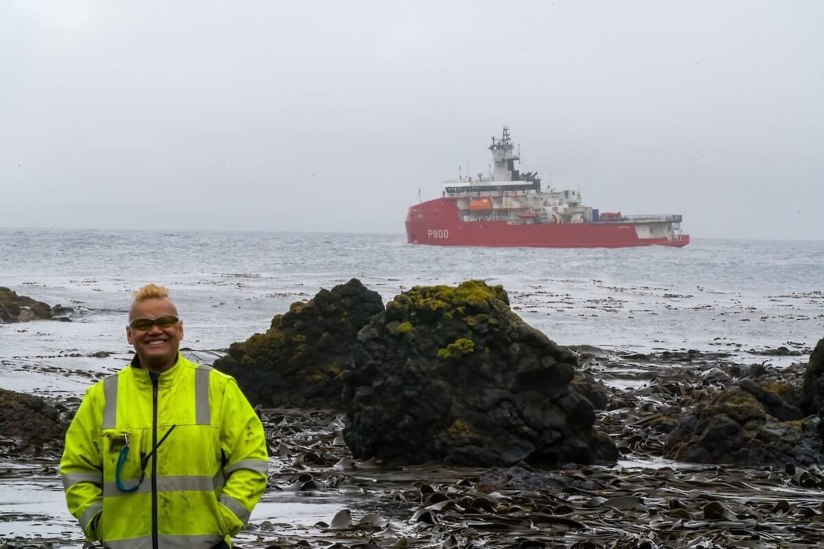 The L’Astrolabe appeared on our misty horizon at roughly 0900 on Monday 15 December. Although the winds weren’t too bad (for Macca), the sea state was a bit ‘interesting’ and we watched the ship roll around in the swell and wondered how those on board were faring.