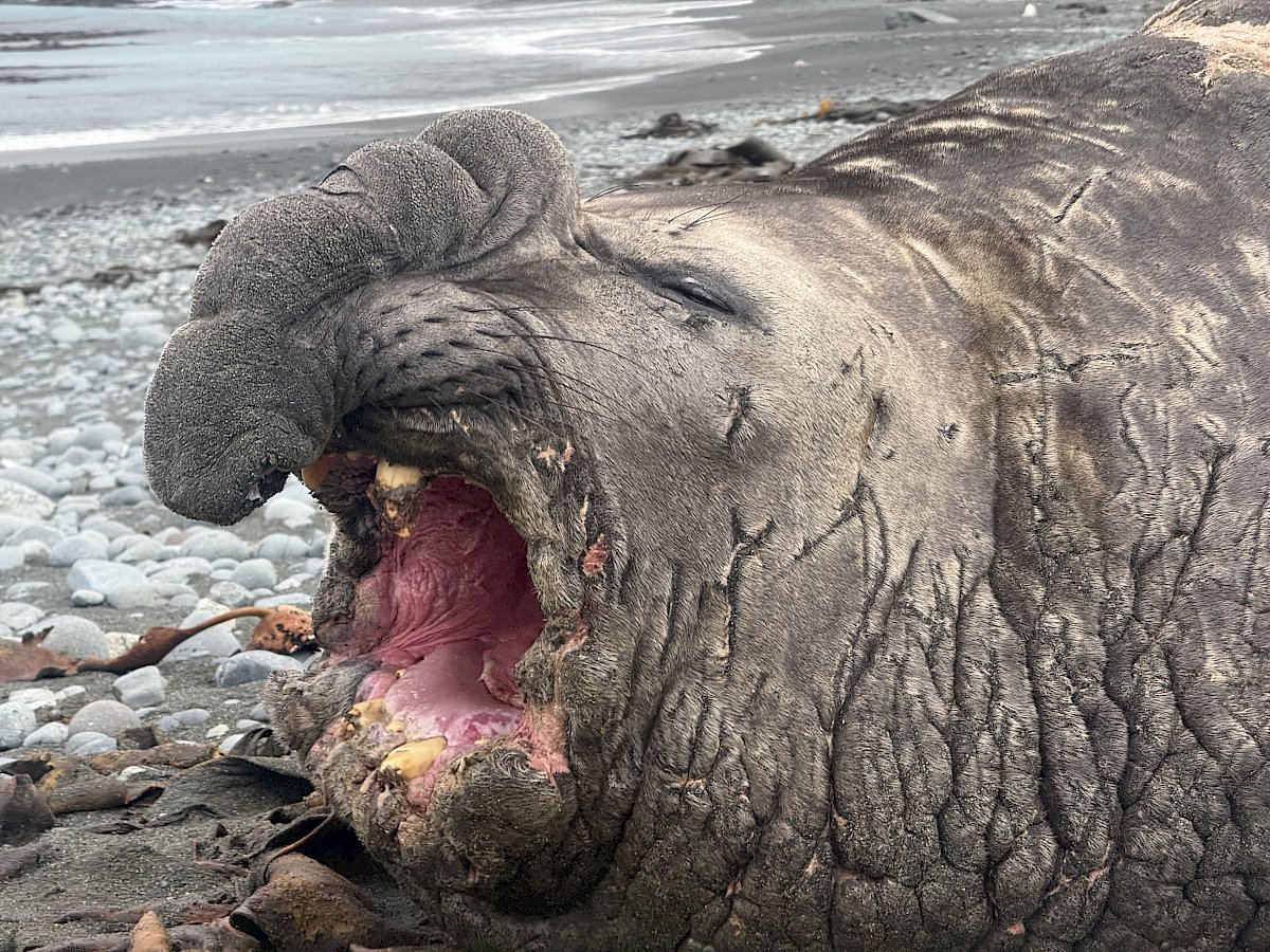 We are seeing an increasing number of large male elephant seals along the isthmus. These large, hulking, scarred titans can grow up to 4-6 metres and weigh up to 4,000 kg.The males have a large, trunk-like nose (proboscis), that is used to produce loud roaring sounds during the mating season. The dominant males are called Beachmasters and control harems of females. Macquarie Island is one of their most important breeding grounds.