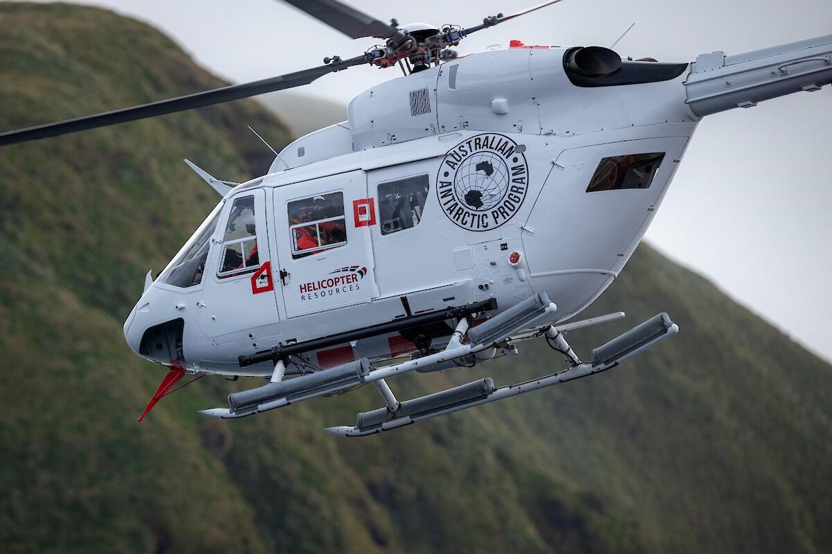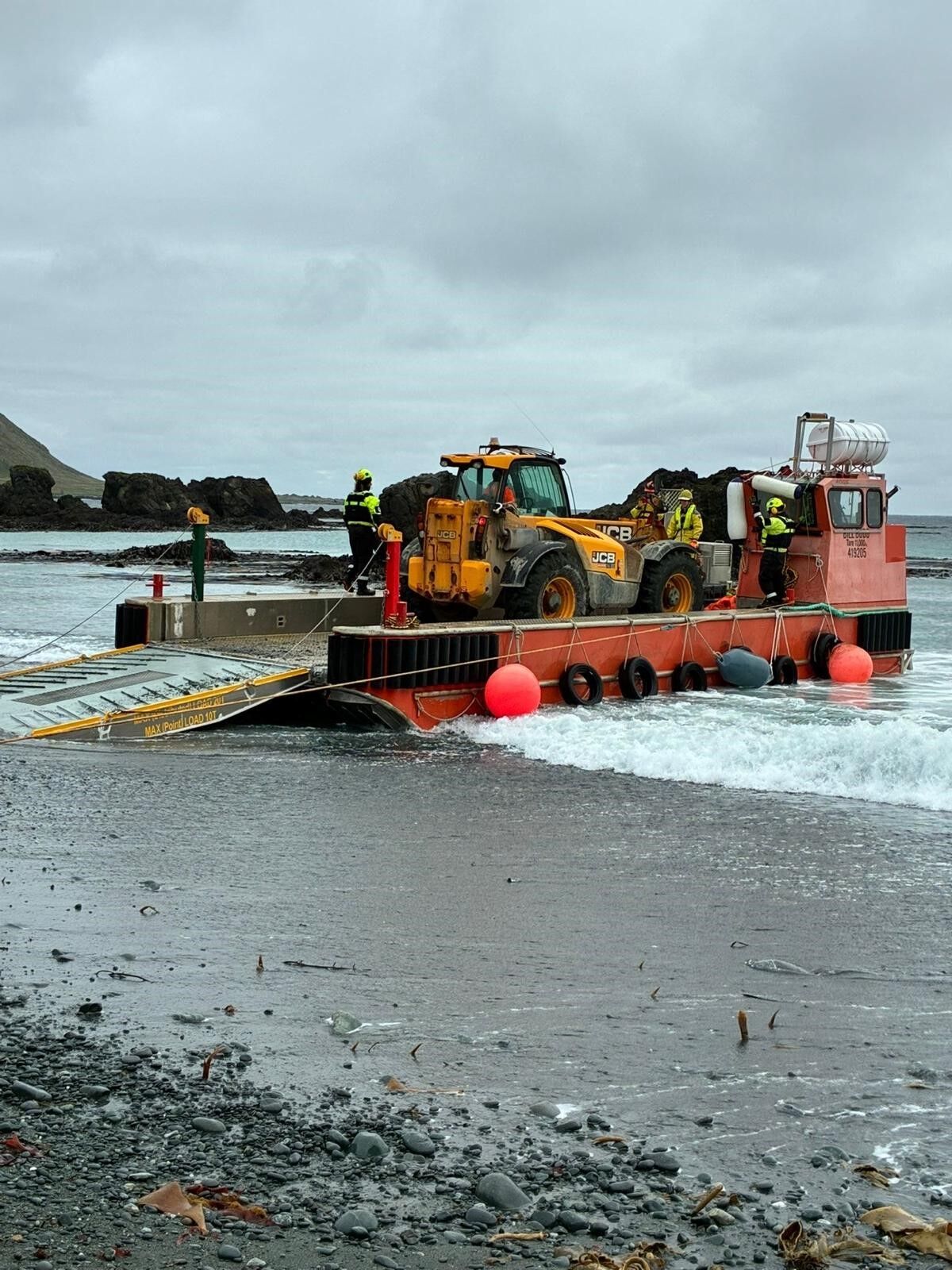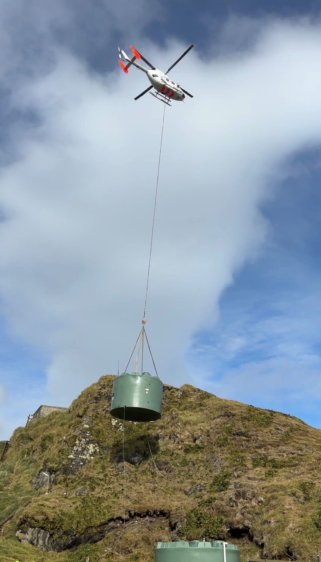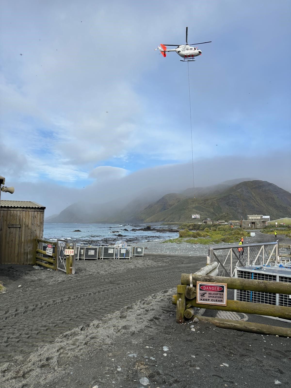 The united effort of the team on the ship and everyone on station has seen much achieved in just 10 days. A lot of challenging cargo loads have been delivered, including flying in a replacement 900 kg, 3.6 m-high x 4.6 m-diameter potable water tank, sending in two new JCBs via barge from the west coast, installing a new X-ray machine, resupplying and 'RTAing' waste from every single field hut on island, completing repeater works on two critical repeater towers down island, and the delivery of numerous long loads, including 10 m lengths of colourbond roofing.