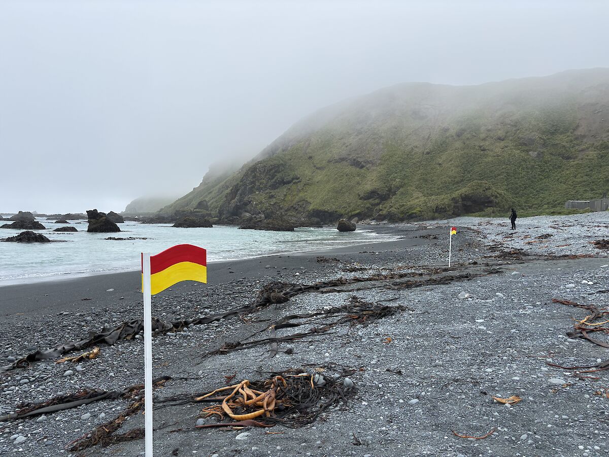 We met in the mess at 0930 where there was a reflection on Australia Day and a ‘Take Five’ safety and wildlife briefing. Our observers took their stations at 1000 where they kept a close eye on the west coast where we would be swimming. The swim area was marked out by flags, away from wildlife and on the safest part of the beach, and the Polaris vehicles, complete with safety and first aid gear, were parked on the heli-pads near the swim site.
