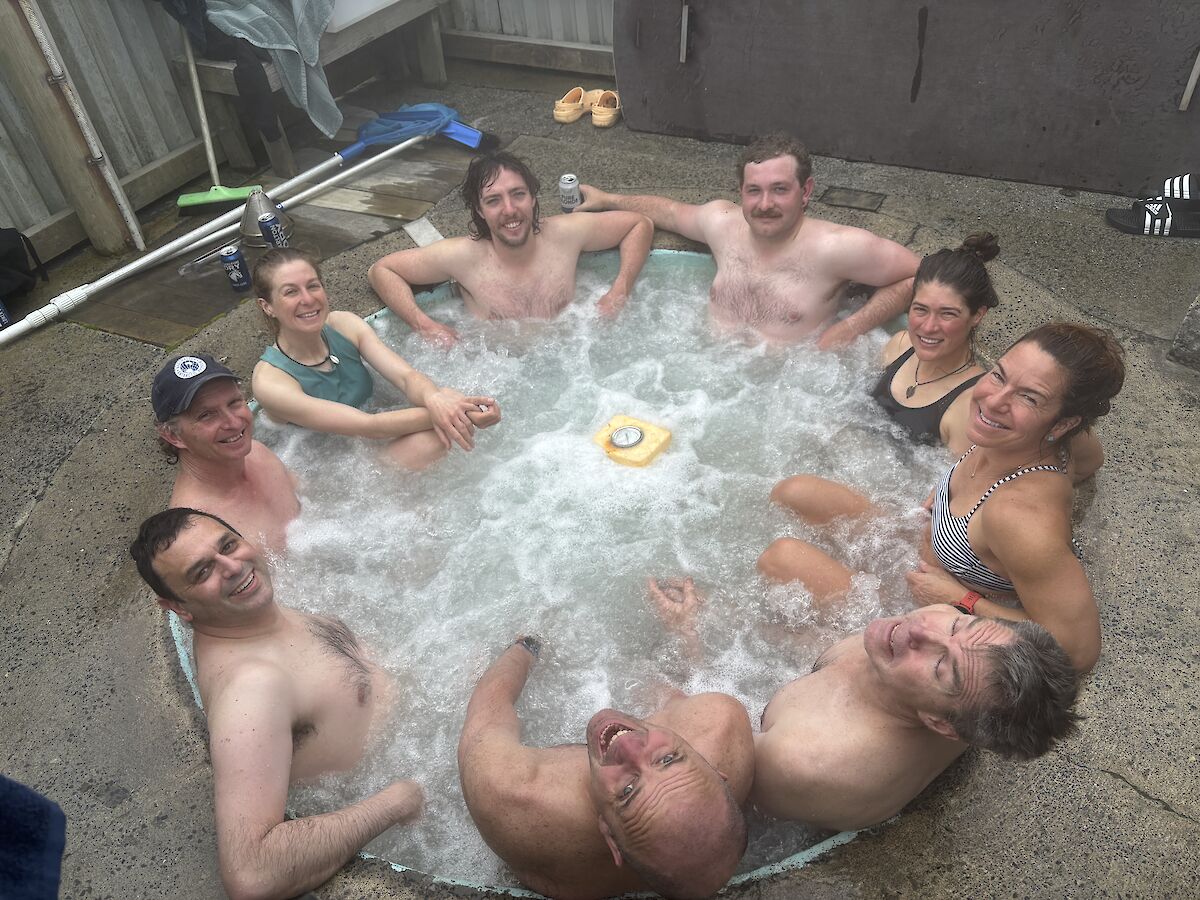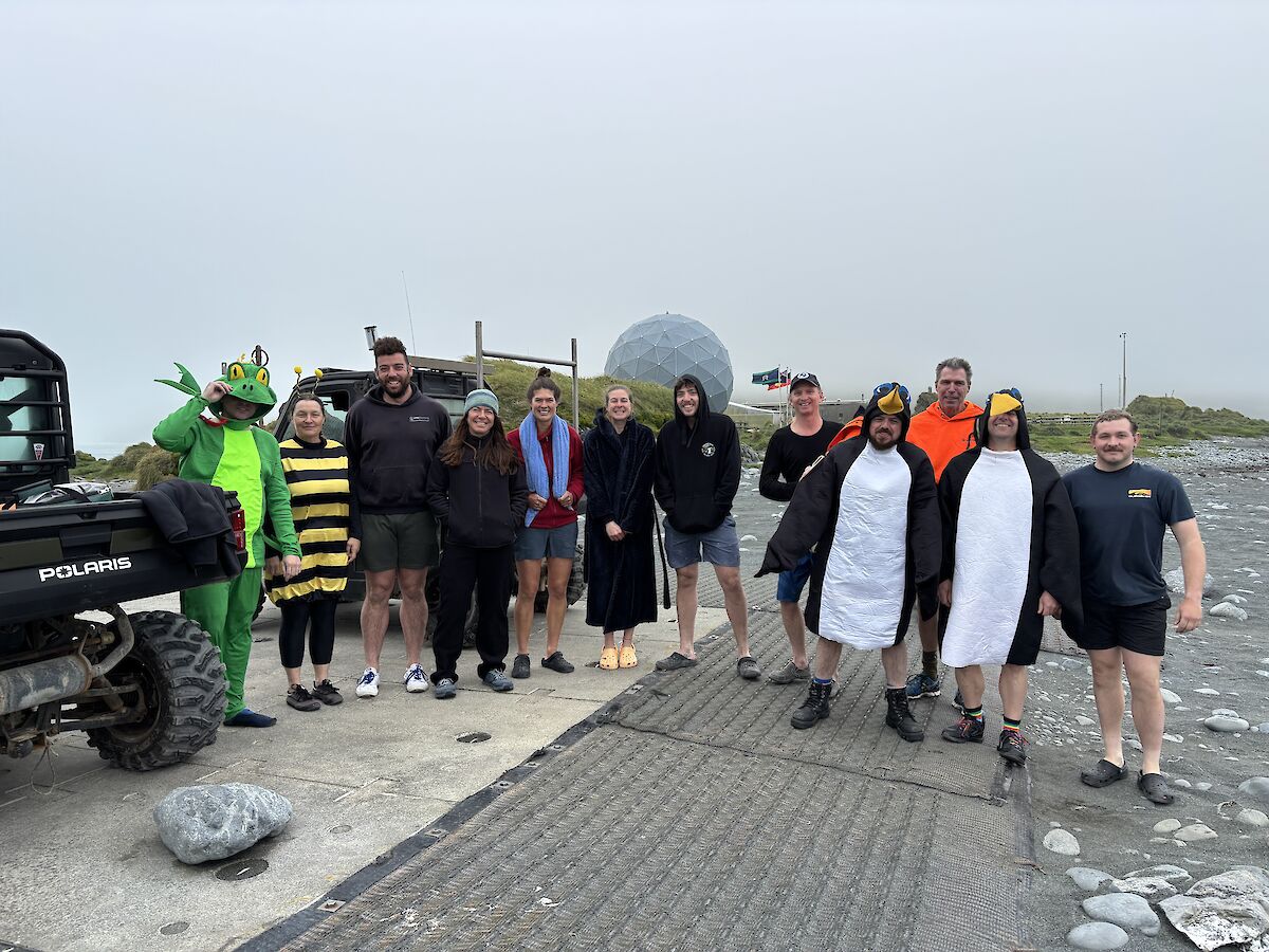 At 1100, the brave assembled on the heli-pads for a team photo before lining up at the flags for the countdown. After confirming with the three observers that there were no obvious risks to swimmers and getting a thumbs up from our lifeguard, the countdown was on and everyone headed out. It was a brief but rewarding encounter with the brisk waters of the Southern Ocean, and most emerged with big grins and remarking how ‘fresh’ it was.
