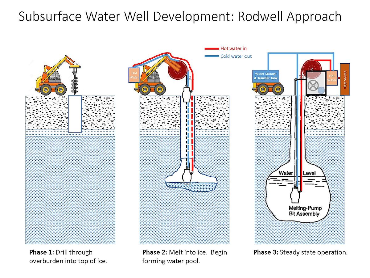 The concept of the system is simple enough, initially a hole is drilled into the ice and hot water is then used to form a cavern below the top layer of snow/ice. Once this has been achieved the melt bell is lowered into the cavern where it will live out its days. While inside the cavern, the bell uses its internal pump to circulate heated water (within itself) that is sourced from an external boiler. This in turn warms the water within our well, melts the surrounding ice and maintains a reservoir of fresh melt water within the cavern. When there is a sufficient amount of water within the well the melt bell pump is then used to transfer the fresh water into a holding tank. Once the transfer is complete, the pump returns to circulation and the process starts again.