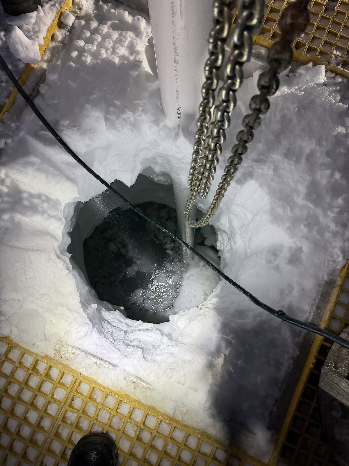 In our water supply building we check the system and make sure all is operating well before taking an often-brisk stroll out to the pontoon that lives above the melt lake. From the pontoon we use a measuring tape to check the level of water within the cavern. Checking the level is essential to the process, because if our water level is below the level of the pump, it could cause the pump to burn out and that would be a very bad day! The dip also gives us a good idea of how our melt cavern is recovering and how much we can take on any given day.