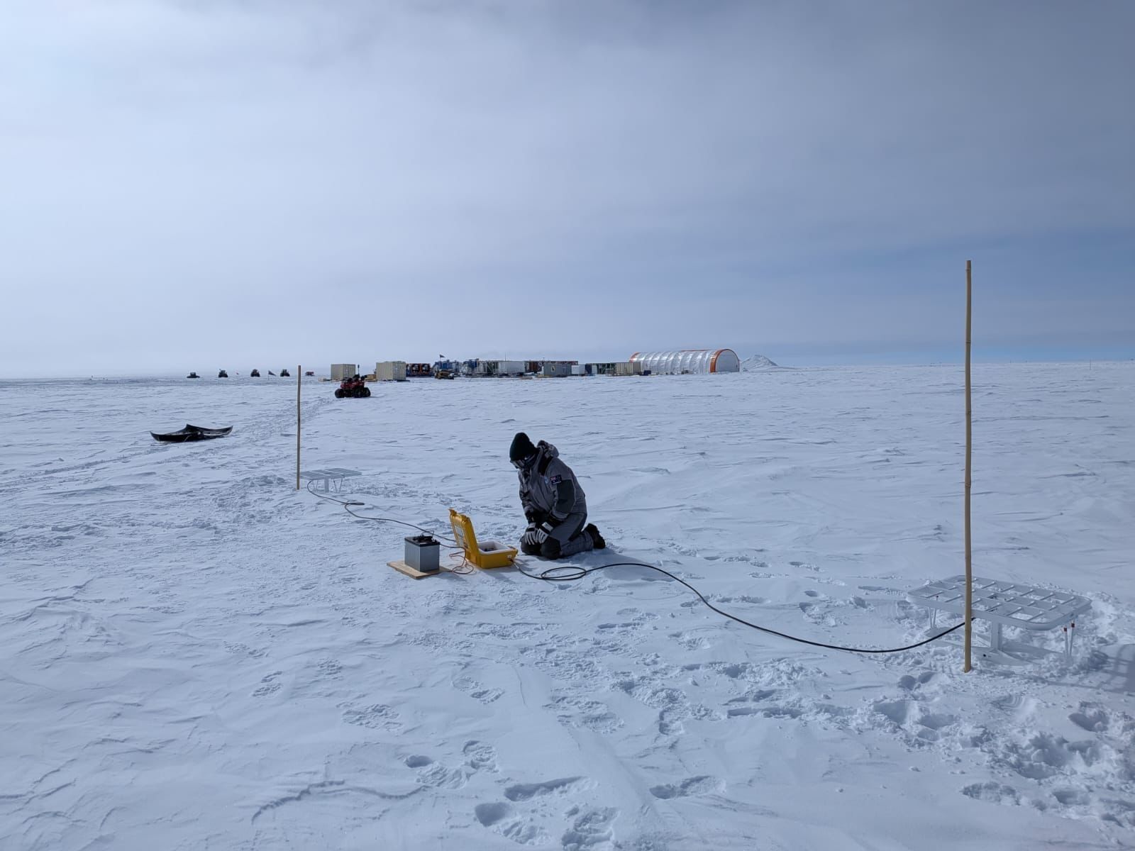 On Saturday morning Lenneke and Julius completed an ApRES (autonomous phase sensitive radio echo sounding) survey at a location established last year close to the drill site. In this technique, radio waves are emitted into the ice sheet from a transmitting antennae at the surface and recorded by a receiving antennae after being reflected by internal layers within the ice sheet.